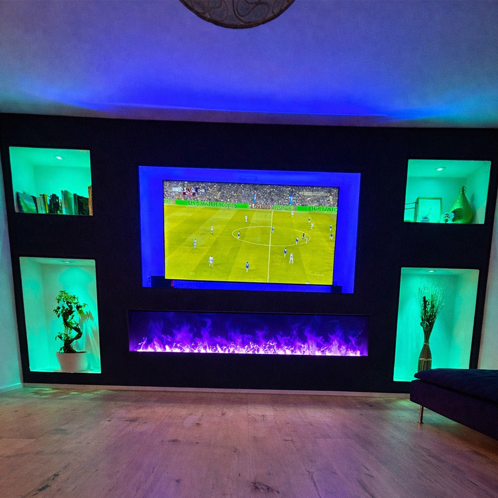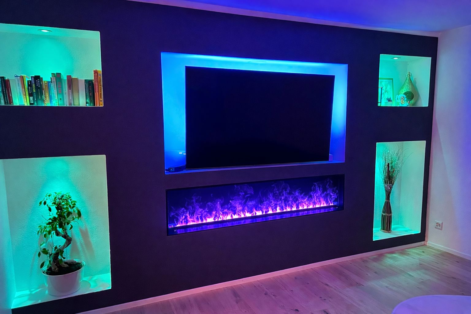 Der Wasserdampfkamin wird nahtlos in die Wohnwand integriert und schafft eine beeindruckend realistische Kaminatmosphäre – ganz ohne echtes Feuer. Durch die Kombination aus feinem Wasserdampf und moderner LED-Lichttechnik entstehen täuschend echte Flammenbilder, die für Wärme im Ambiente sorgen, jedoch ohne Hitze, Rauch oder Emissionen.